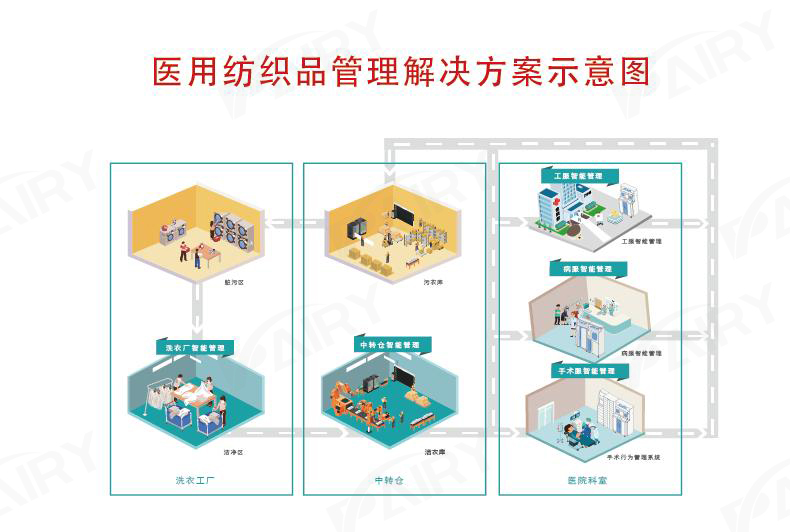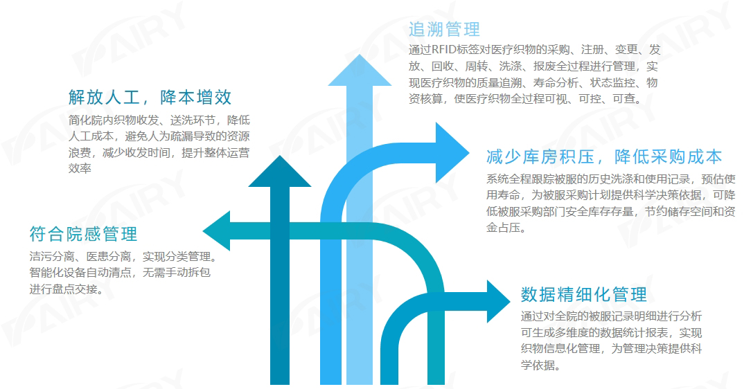 医用织物被服管理系统是医疗机构用于管理医用织物被服/工服(如病号服、床单、手术巾等)的专用系统,旨在提高医用织物的流转效率、确保卫生安全并降低运营成本。通过在上述织物被服中植入RFID电子标签和配备在每个病区的智能回收机和智能发物机等智能设备,可以实现医用织物被服在病区的智能化流转,有效降低院感风险。
